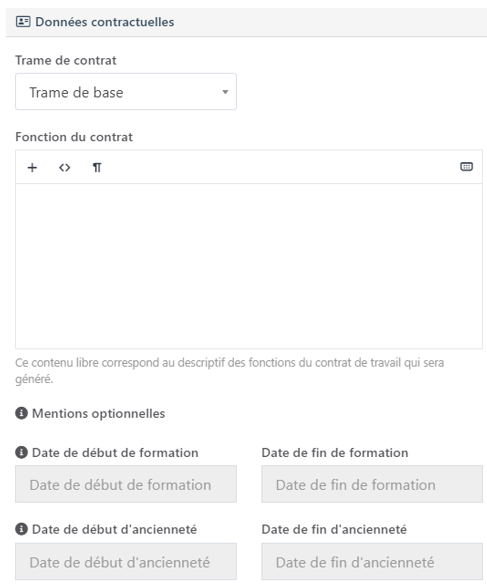 FONCTION DU CONTRAT = Champs libre à compléter qui apparaitra sur le contrat