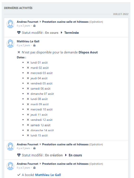 Timeline : Fait ressortir par ordre chronologique les dernières informations de la plateforme (Par exemple l’acceptation d’un devis, l’envoie d’un mail, …).
