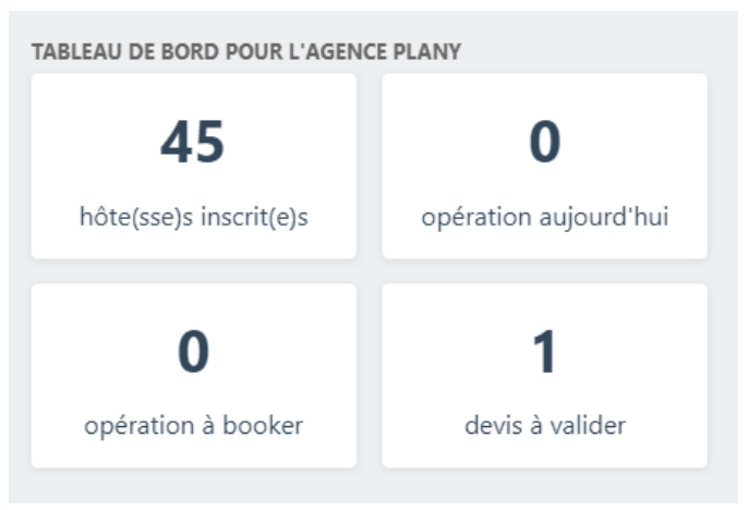 Indicateurs : Chiffres en temps réel des utilisateurs inscrits, des opérations en cours, des opérations à booker, des devis à valider.