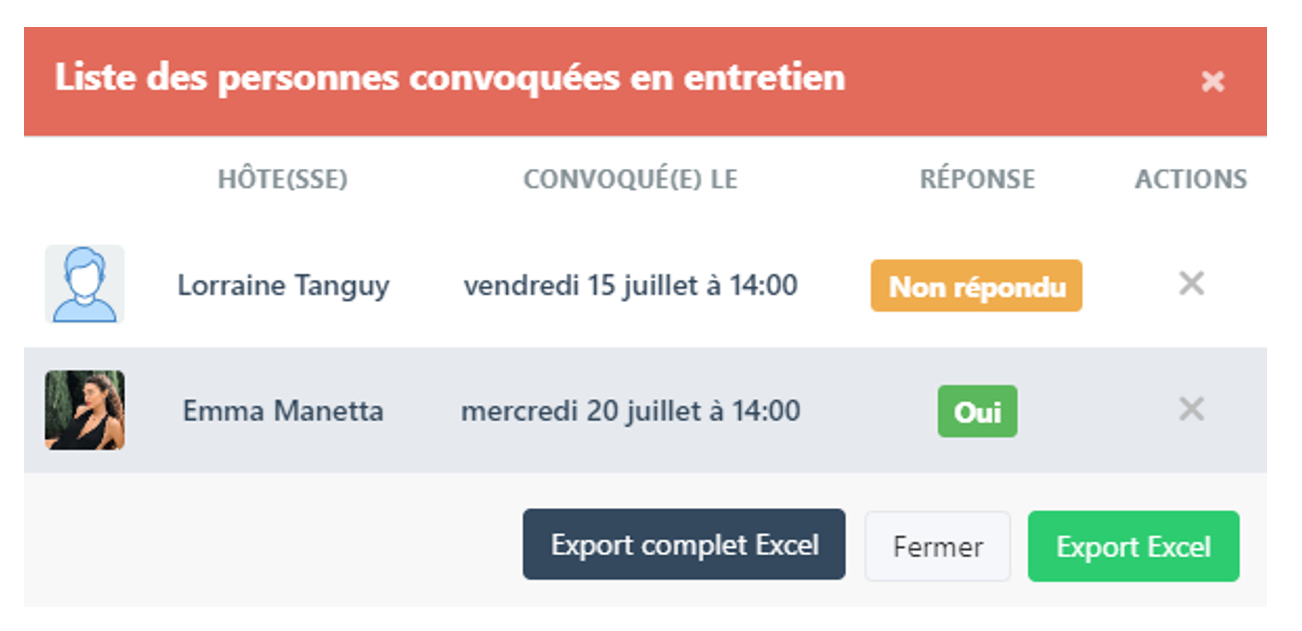 CONVOCATIONS ENTRETIEN = Vous affiche la liste des personnes convoqués en entretien ainsi que leur réponse.