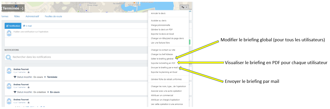 Vous pouvez écrire et envoyer un briefing aux utilisateurs bookés depuis l’opération.