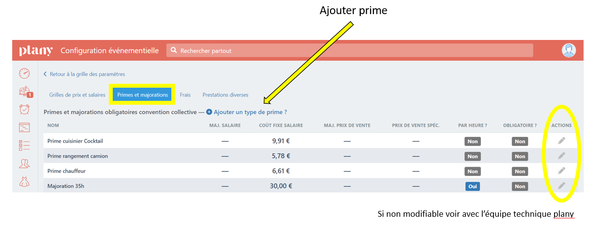 Vous pouvez ajouter ou modifier des primes HORMIS celles noté en obligatoires (Liés à la convention collective)
