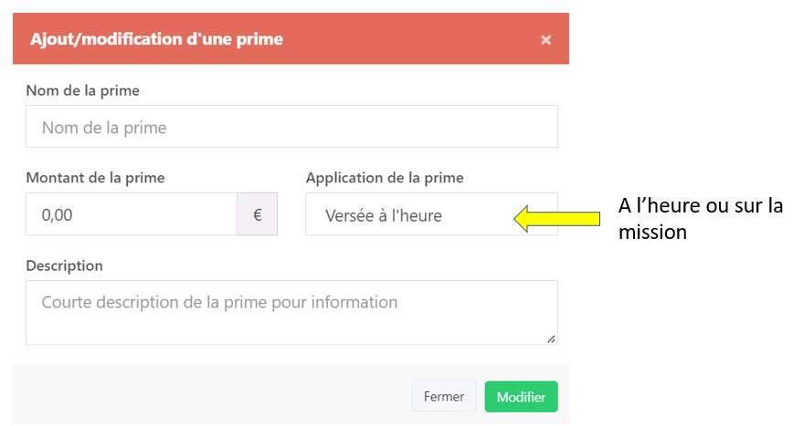 PRIME VERSE EN UNE FOIS = Calculé sur la mission (Par exemple prime pour 3 jours de mission)
