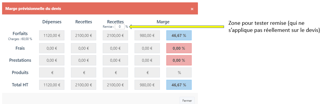 OBTENIR LA MARGE PRÉVISIONNELLE DU DEVIS permet d’afficher un tableau avec des informations de marge sur les forfaits et le frais.