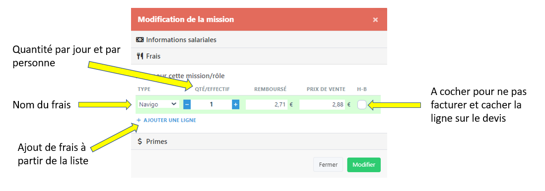 Toujours dans la fenêtre de modification de la ligne mission vous trouvez le menu FRAIS. Ces FRAIS sont appliqués uniquement aux lignes de la mission sélectionné.