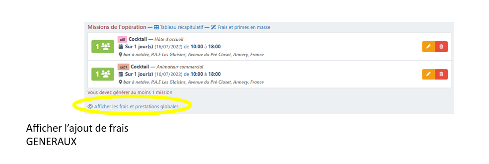 Le bouton FRAIS AUTOMATIQUES au-dessus de la ligne des missions vous permet d’affecter facilement des frais et des primes à plusieurs à plusieurs missions en même temps (Les FRAIS restent liés à chaque ligne contrairement aux FRAIS DE L’OPÉRATION qui sont généraux)