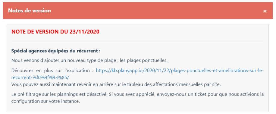 version lors de votre connexion une « pop-up » s’affiche avec les notes de version et l’historique des