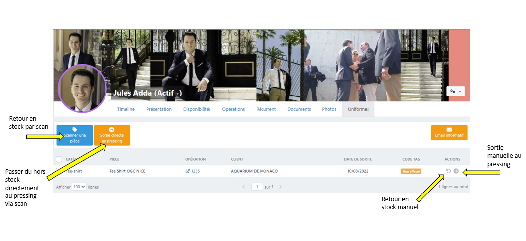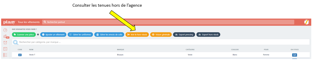 Vous ne savez pas à qui appartient la tenue qui vient de revenir ? Grâce au scan du Hors-Stock vous pouvez scanner n’importe quelle tenue qui était à l’extérieur et automatiquement elle entrera en stock.