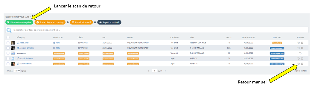 La liste de toutes les tenues de l’hôtesse sont visibles dans cette interface, vous pouvez décider les faire revenir par le scan ou manuellement.