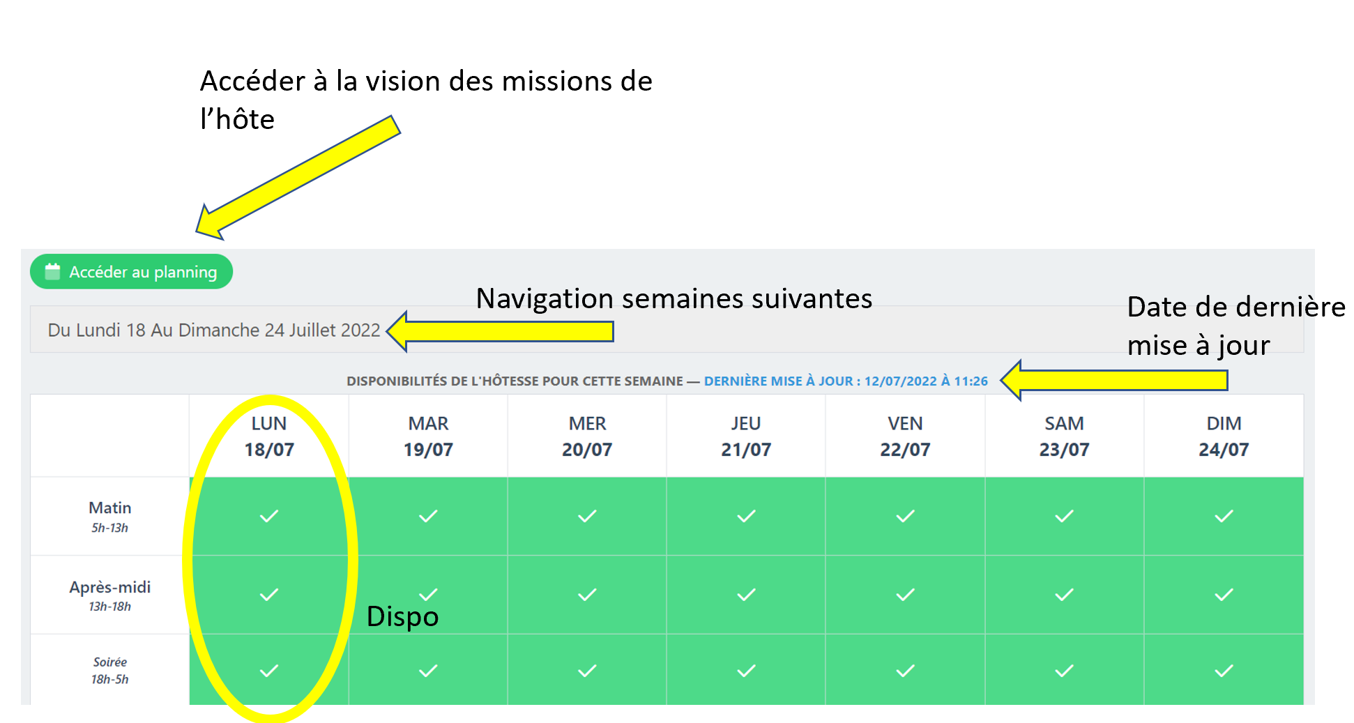 Vous pouvez visualiser le planning des disponibilités de l’hôte/hôtesse en allant sur son profil puis dans l’onglet DISPONIBILITÉS