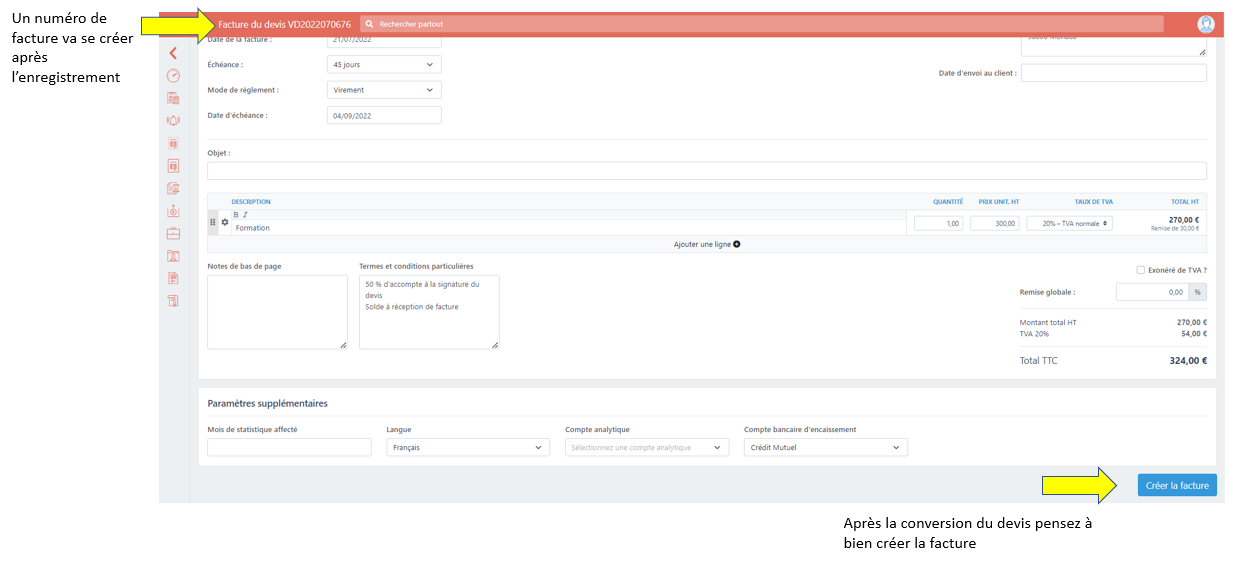 /!\ ATTENTION : Si vous quittez la page avant de faire CREER LA FACTURE celle-ci ne sera pas enregistré par le logiciel.